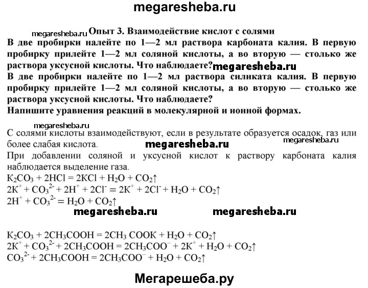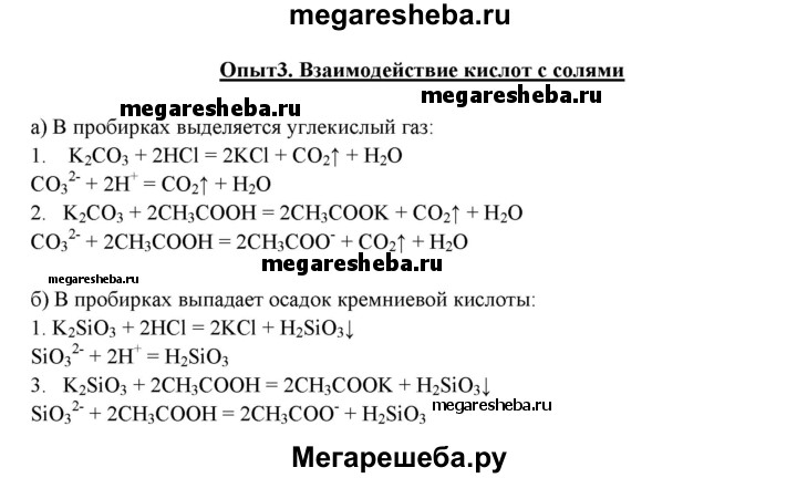 Опыт 3. Взаимодействие кислот с солями. В две пробирки налейте по 1—2 мл раствора карбоната калия. В первую пробирку прилейте 1—2 мл соляной кислоты, а во вторую — столько же раствора уксусной кислоты. Что наблюдаете? В две пробирки налейте по 1—2 мл раствора силиката калия. В первую пробирку прилейте 1—2 мл соляной кислоты, а во вторую — столько же раствора уксусной кислоты. Что наблюдаете? Напишите уравнения реакций в молекулярной и ионной формах.