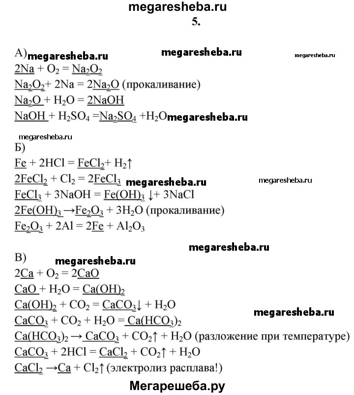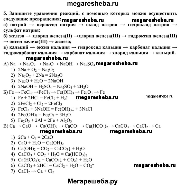 5. Запишите уравнения реакций, с помощью которых можно осуществить следующие превращения: а) натрий → пероксид натрия → оксид натрия → гидроксид натрия → сульфат натрия; б) железо → хлорид железа (II) → хлорид железа (III) → → гидроксид железа (III) → оксид железа (III) → железо; в) кальций → оксид кальция → гидроксид кальция → → карбонат кальция → гидрокарбонат кальция → → карбонат кальция → хлорид кальция → кальций.