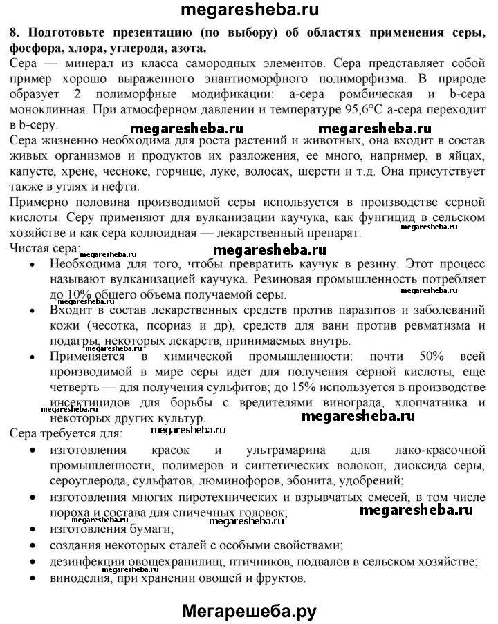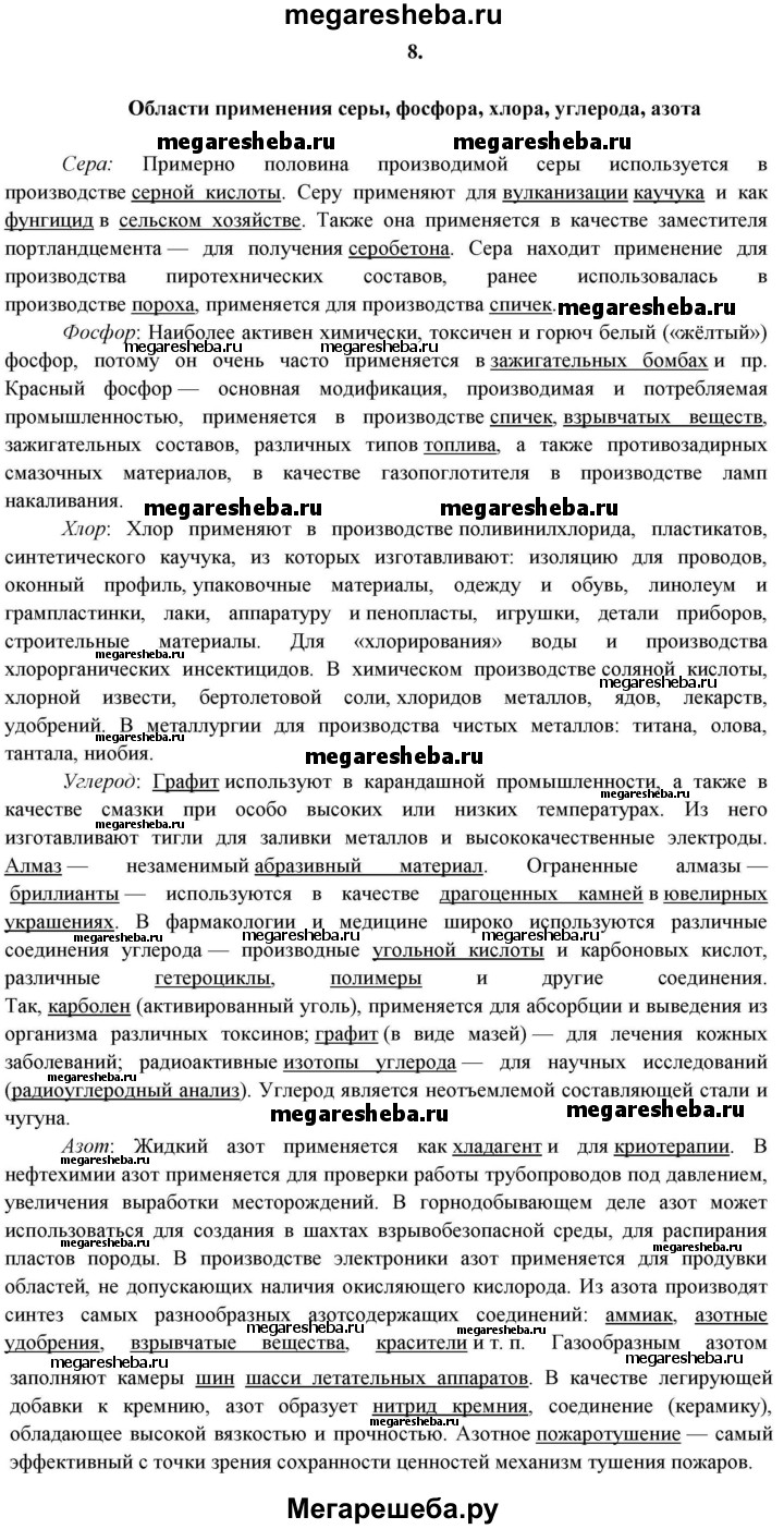8. Подготовьте презентацию (по выбору) об областях применения серы, фосфора, хлора, углерода, азота.