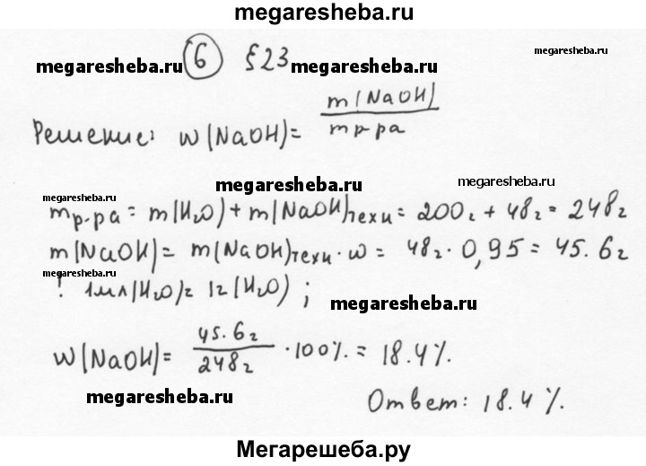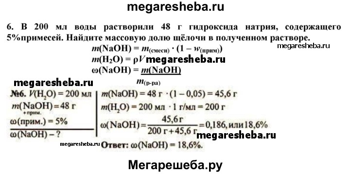 6. В 200 мл воды растворили 48 г гидроксида натрия, содержащего 5%примесей. Найдите массовую долю щёлочи в полученном растворе.