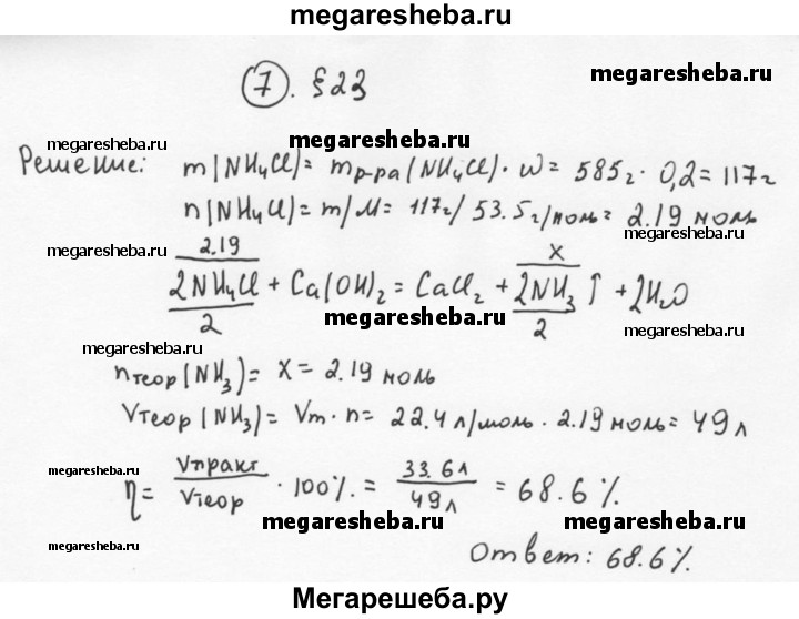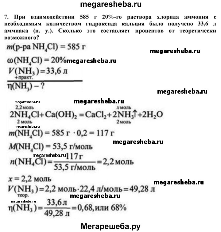 7. При взаимодействии 585 г 20%-го раствора хлорида аммония с необходимым количеством гидроксида кальция было получено 33,6 л аммиака (н. у.). Сколько это составляет процентов от теоретически возможного?