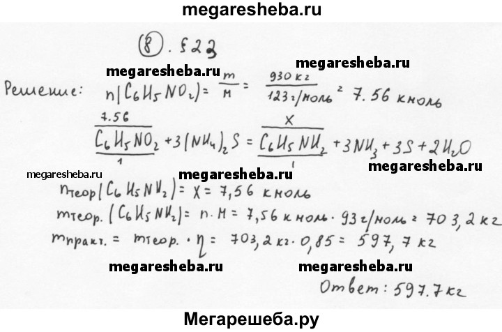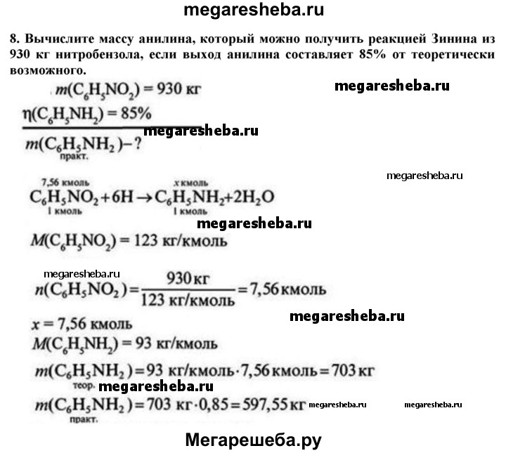 8. Вычислите массу анилина, который можно получить реакцией Зинина из 930 кг нитробензола, если выход анилина составляет 85% от теоретически возможного.