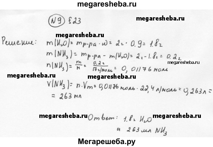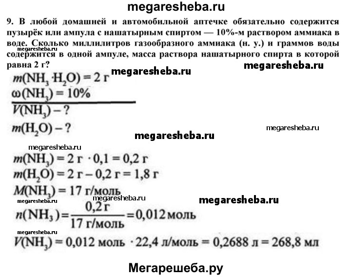 9. В любой домашней и автомобильной аптечке обязательно содержится пузырёк или ампула с нашатырным спиртом — 10%-м раствором аммиака в воде. Сколько миллилитров газообразного аммиака (н. у.) и граммов воды содержится в одной ампуле, масса раствора нашатырного спирта в которой равна 2 г??