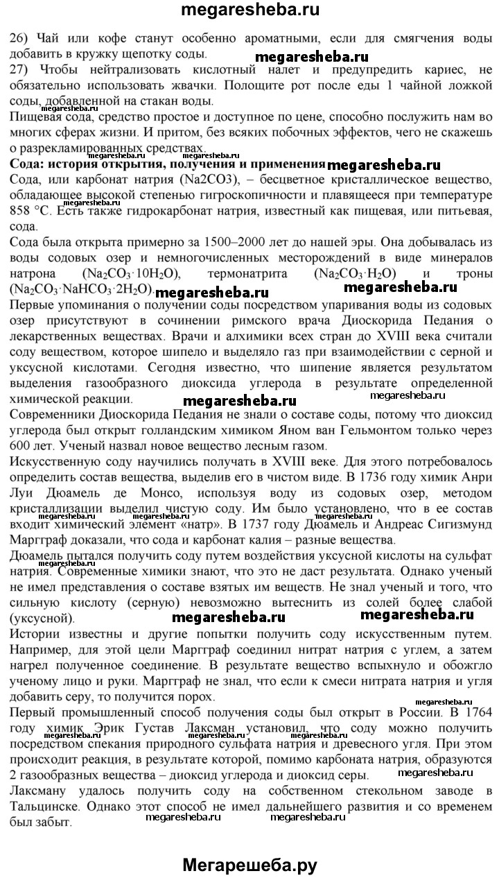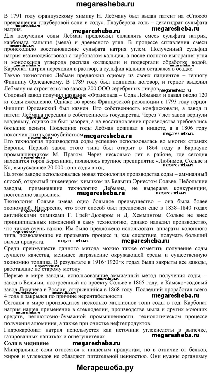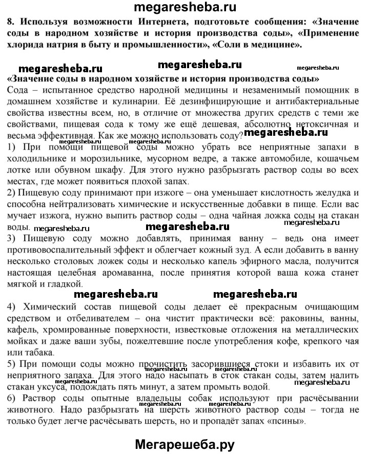 8. Используя возможности Интернета, подготовьте сообщения: «Значение соды в народном хозяйстве и история производства соды», «Применение хлорида натрия в быту и промышленности», «Соли в медицине».