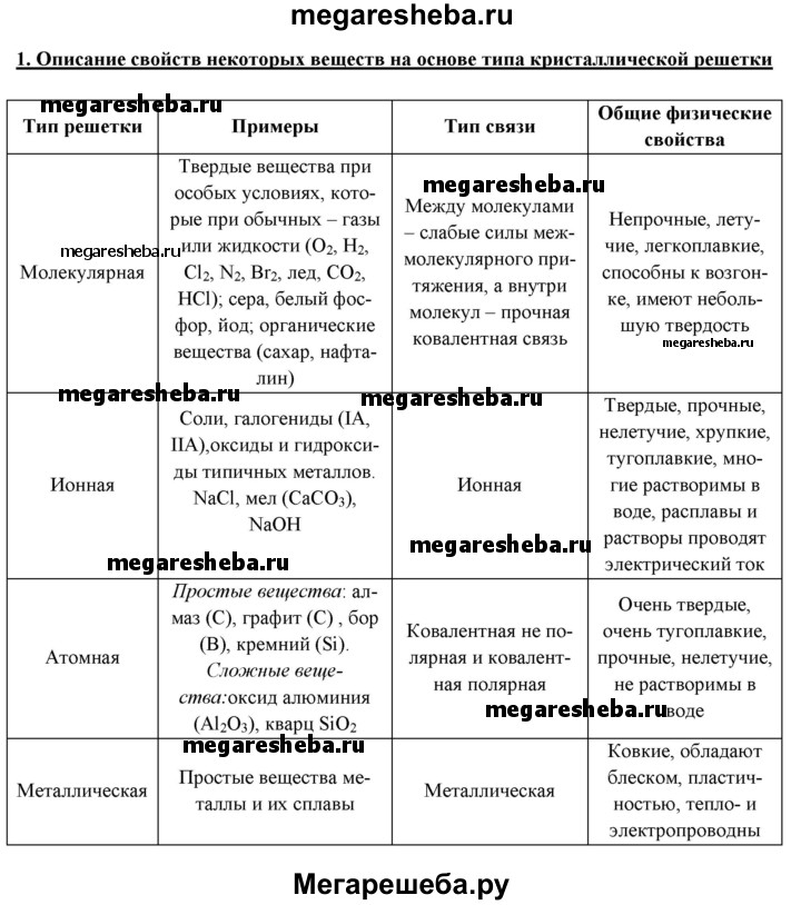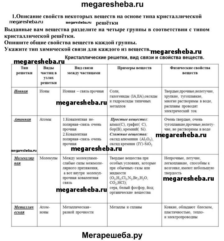 1. Описание свойств некоторых веществ на основе типа кристаллической решётки. Выданные вам вещества разделите на четыре группы в соответствии с типом кристаллической решётки. Опишите общие свойства веществ каждой группы. Укажите тип химической связи для каждого из веществ.