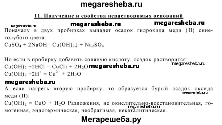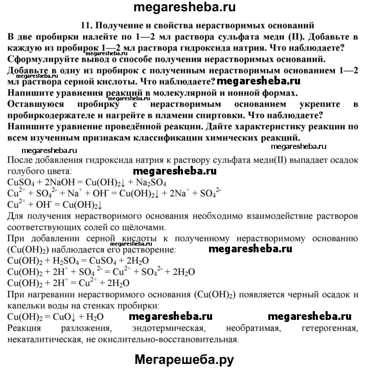11. Получение и свойства нерастворимых оснований. В две пробирки налейте по 1—2 мл раствора сульфата меди (II). Добавьте в каждую из пробирок 1—2 мл раствора гидроксида натрия. Что наблюдаете? Сформулируйте вывод о способе получения нерастворимых оснований. Добавьте в одну из пробирок с полученным нерастворимым основанием 1—2 мл раствора серной кислоты. Что наблюдаете? Напишите уравнения реакций в молекулярной и ионной формах. Оставшуюся пробирку с нерастворимым основанием укрепите в пробиркодержателе и нагрейте в пламени спиртовки. Что наблюдаете? Напишите уравнение проведённой реакции. Дайте характеристику реакции по всем изученным признакам классификации химических реакций.