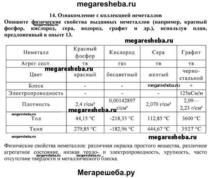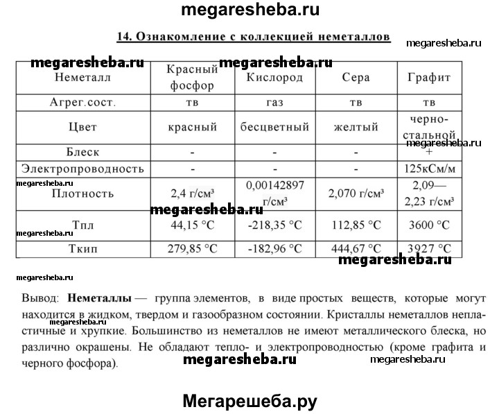 14. Ознакомление с коллекцией неметаллов. Опишите физические свойства выданных неметаллов (например, красный фосфор, кислород, сера, водород, графит и др.), используя план, предложенный в опыте 13.