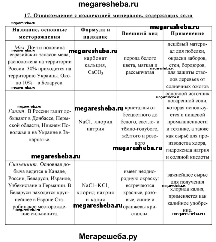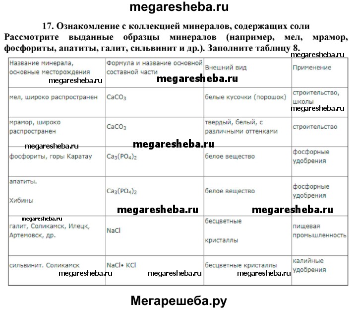 17. Ознакомление с коллекцией минералов, содержащих соли. Рассмотрите выданные образцы минералов (например, мел, мрамор, фосфориты, апатиты, галит, сильвинит и др.). Заполните таблицу 8.