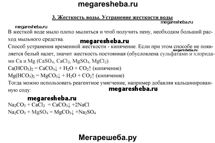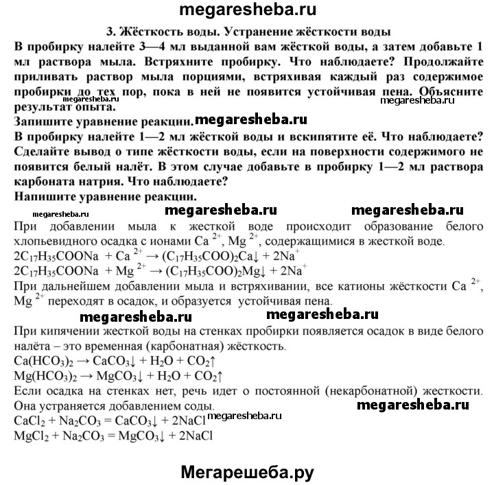 3. Жёсткость воды. Устранение жёсткости воды. В пробирку налейте 3—4 мл выданной вам жёсткой воды, а затем добавьте 1 мл раствора мыла. Встряхните пробирку. Что наблюдаете? Продолжайте приливать раствор мыла порциями, встряхивая каждый раз содержимое пробирки до тех пор, пока в ней не появится устойчивая пена. Объясните результат опыта. Запишите уравнение реакции. В пробирку налейте 1—2 мл жёсткой воды и вскипятите её. Что наблюдаете? Сделайте вывод о типе жёсткости воды, если на поверхности содержимого не появится белый налёт. В этом случае добавьте в пробирку 1—2 мл раствора карбоната натрия. Что наблюдаете? Напишите уравнение реакции.