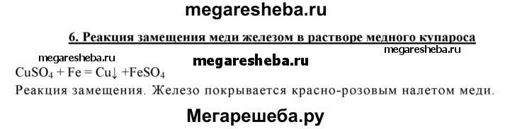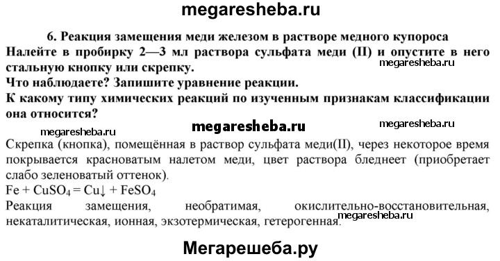 6. Реакция замещения меди железом в растворе медного купороса. Налейте в пробирку 2—3 мл раствора сульфата меди (II) и опустите в него стальную кнопку или скрепку. Что наблюдаете? Запишите уравнение реакции. К какому типу химических реакций по изученным признакам классификации она относится?