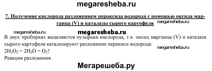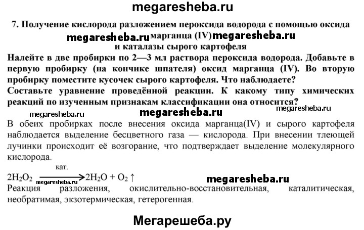 7. Получение кислорода разложением пероксида водорода с помощью оксида марганца (IV) и каталазы сырого картофеля. Налейте в две пробирки по 2—3 мл раствора пероксида водорода. Добавьте в первую пробирку (на кончике шпателя) оксид марганца (IV). Во вторую пробирку поместите кусочек сырого картофеля. Что наблюдаете? Составьте уравнение проведённой реакции. К какому типу химических реакций по изученным признакам классификации она относится?