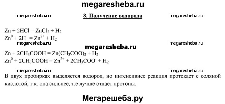 8. Получение водорода. В две пробирки поместите по одной грануле цинка. В одну пробирку с цинком налейте 1 мл соляной кислоты, а в другую — столько же уксусной. Что наблюдаете? Напишите уравнения реакций в молекулярной и ионной формах.