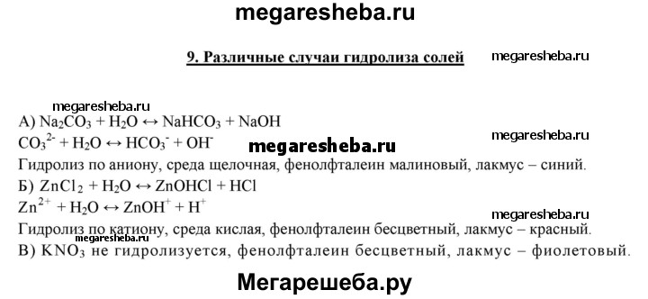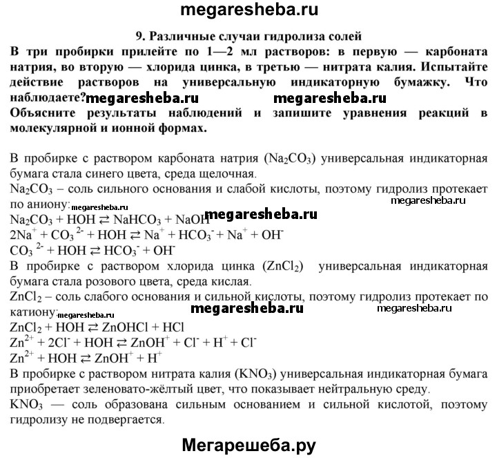 9. Различные случаи гидролиза солей. В три пробирки прилейте по 1—2 мл растворов: в первую — карбоната натрия, во вторую — хлорида цинка, в третью — нитрата калия. Испытайте действие растворов на универсальную индикаторную бумажку. Что наблюдаете? Объясните результаты наблюдений и запишите уравнения реакций в молекулярной и ионной формах.