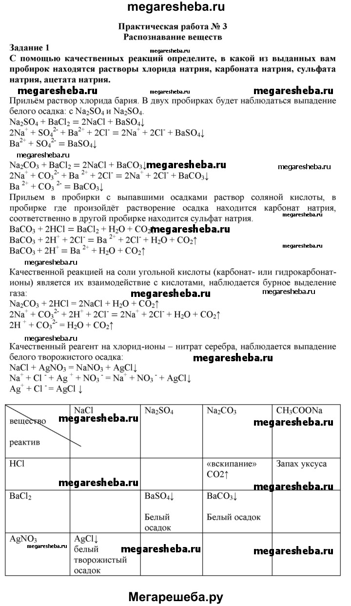 Практическая работа №3. Распознавание веществ. Задание 1. С помощью качественных реакций определите, в какой из выданных вам пробирок находятся растворы хлорида натрия, карбоната натрия, сульфата натрия, ацетата натрия.