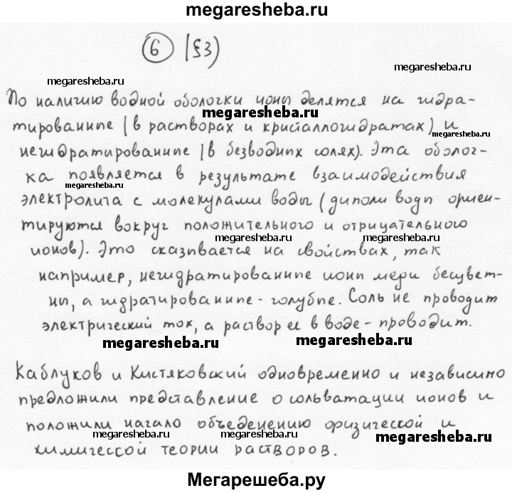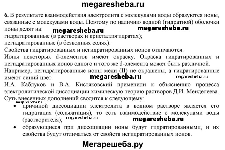 6. Почему принято делить ионы на гидратированные и негидратированные? Сказывается ли наличие гидратной оболочки на свойствах ионов? Какую роль сыграли русские химики Каблуков и Кистяковский в развитии представлений об электролитической диссоциации, с которыми вы знакомились в курсе основной школы?