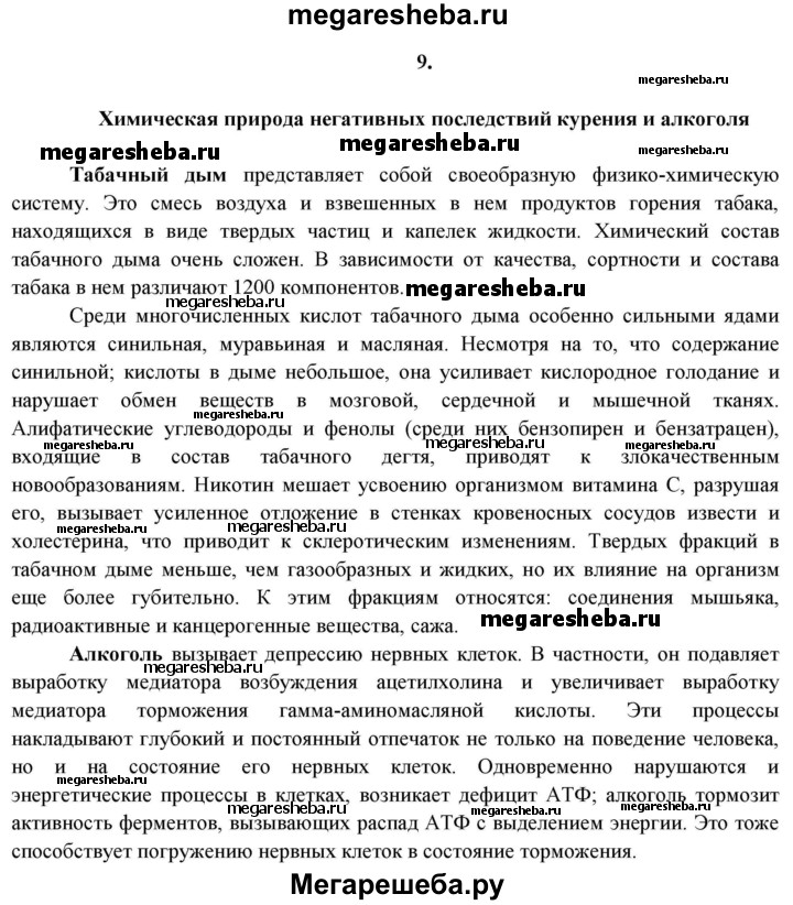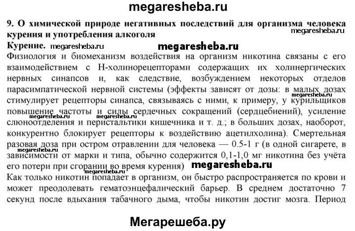 9. Подготовьте сообщение о химической природе негативных последствий для организма человека курения и употребления алкоголя, используя различные источники информации и ЦОРы.