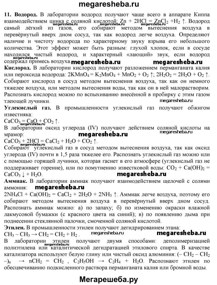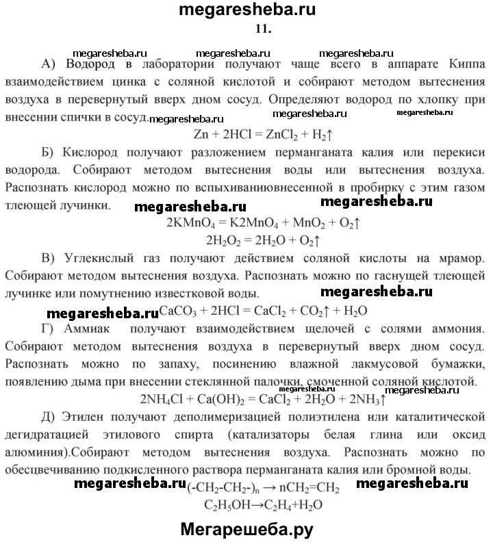 11. Как получить, собрать и распознать: а) водород; б) кислород; в) углекислый газ; г) аммиак; д) этилен?