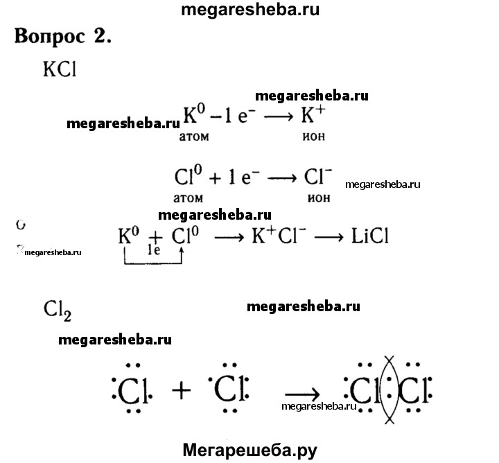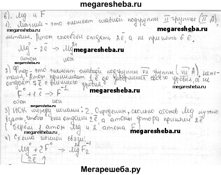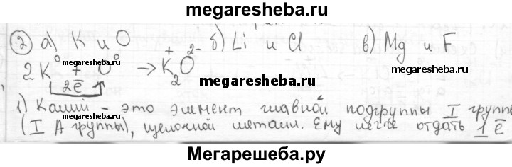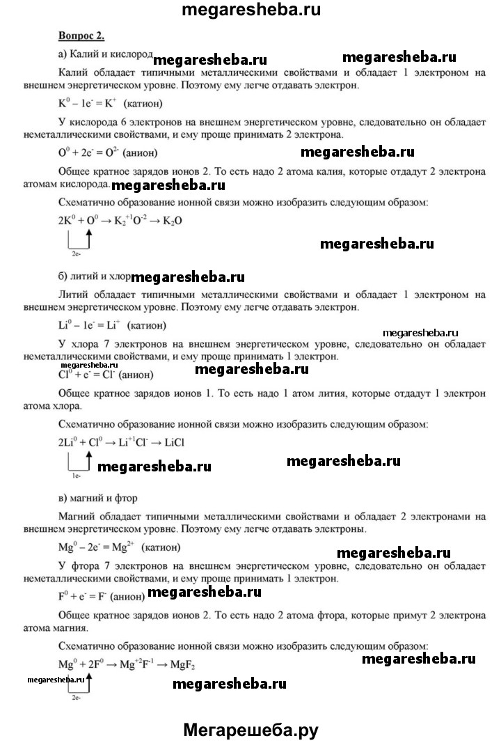 2. Рассмотрите схемы образования ионной связи между атомами химических элементов: а) калия и кислорода; б) лития и хлора; в) магния и фтора.