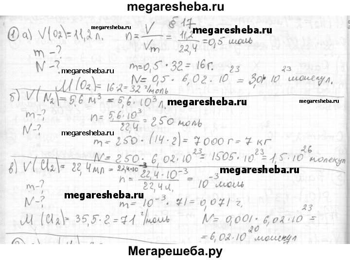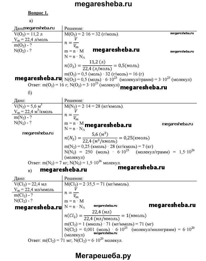 1. Найдите массу и число молекул при н. у. для: а) 11,2 л кислорода; б) 5,6 м^3 азота; в) 22,4 мл хлора.