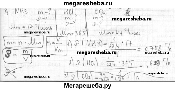 3. Найдите плотность (массу 1 л) при н. у.: а) аммиака; б) хлороводорода; в) углекислого газа.