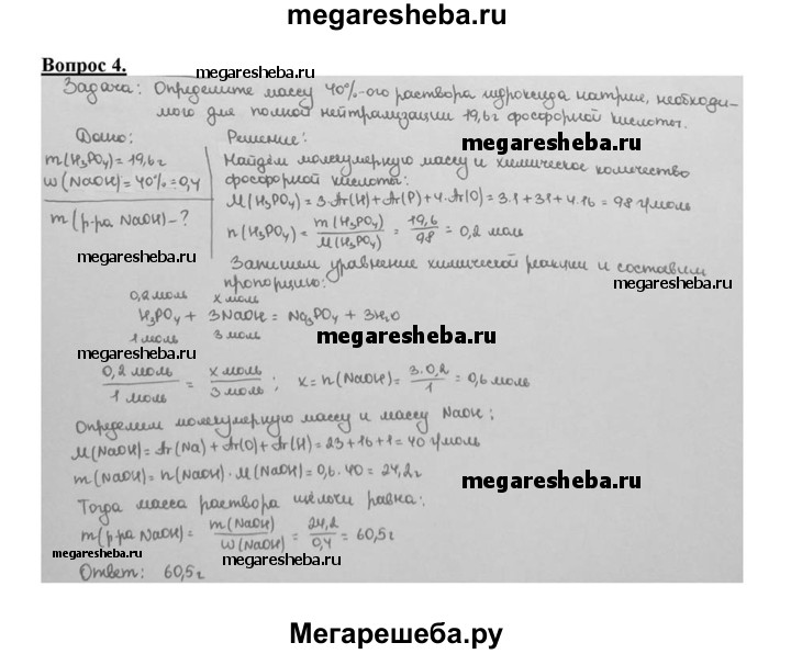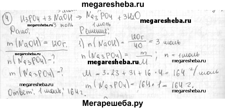 4. Придумайте условие задачи, в которой необходимо использовать приведённое ниже уравнение, и решите её: H3PO4 + 3NaOH = Na3PO4 + 3H2O.
