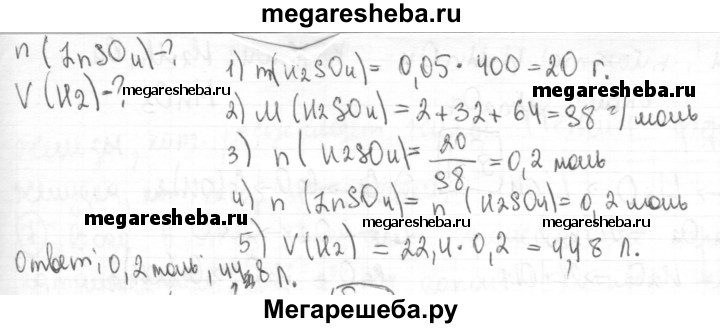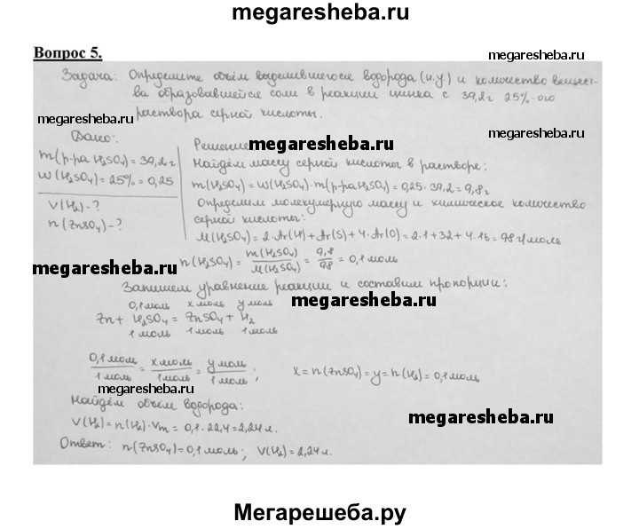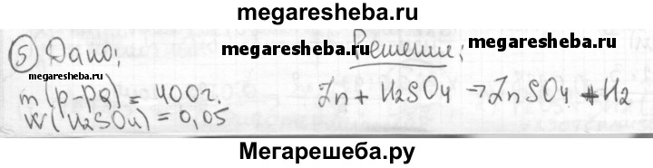 5. Придумайте и решите задачу, в условиях которой была бы дана масса раствора вещества с определённой массовой долей растворённого вещества, а требовалось бы найти количество вещества одного из веществ и объём другого. При составлении задачи используйте уравнение реакции: Zn + H2SO4 = ZnSO4 + H2.