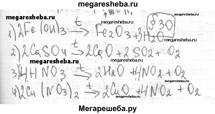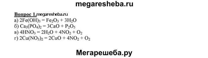 1. Запишите уравнения реакций разложения, схемы которых: а) Fe(OH)3 →(t) Fe2O3 + H2O; б) Сa3(РО4)2 →(t) CaO + P2O5; в) HNO3 →(t) H2O + NO2 + O2; г) Cu(NO3)2 →(t) CuO + NO2 + O2.