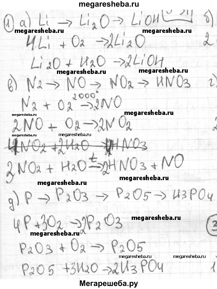 1. Запишите уравнения реакций соединения, протекающих согласно схемам: а) Li → Li2O→ LiOH; б) Ca→ CaO→ Ca(OH)2; в) N2→ NO → NO2→ HNO3; г) S→ SO2 →SO3 → H2SO4; д) P→ P2O3→ P2O5 → H3PO4.