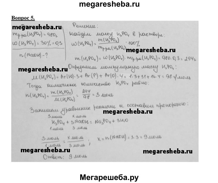 5. Определите количество вещества гидроксида натрия, которое потребуется для полной нейтрализации 980 г 30%-го раствора фосфорной кислоты.