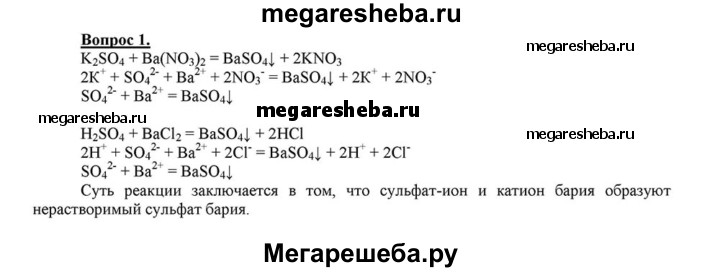 1. Запишите молекулярные и ионные уравнения реакций, о которых говорилось в первой части параграфа, — между сульфатом калия и нитратом бария, между серной кислотой и хлоридом бария. В чём суть обеих реакций?