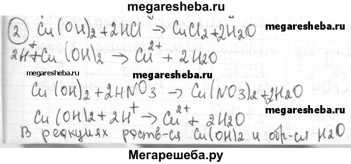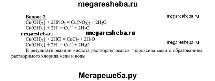 1. Запишите молекулярные и ионные уравнения реакций, о которых говорилось в первой части параграфа, — между сульфатом калия и нитратом бария, между серной кислотой и хлоридом бария. В чём суть обеих реакций? 2. Запишите молекулярные и ионные уравнения реакций, о которых говорилось во второй части параграфа, — между гидроксидом меди (II) и соляной кислотой, между гидроксидом меди (II) и азотной кислотой. В чём суть обеих реакций?