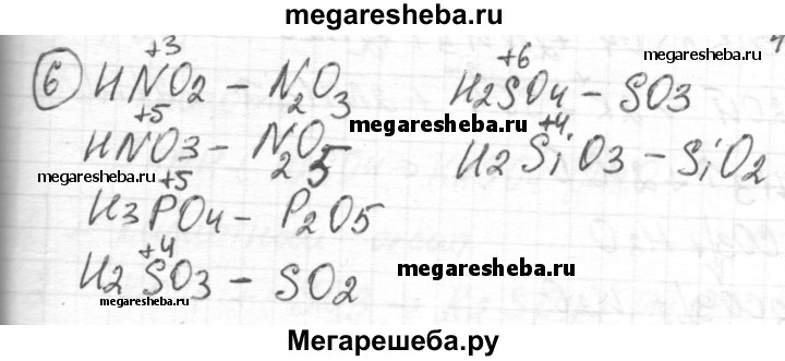 6. Запишите формулы оксидов, соответствующих следующим кислотам: HNO2, HNO3, H3PO4, H2SO3, H2SO4, H2SiO3.