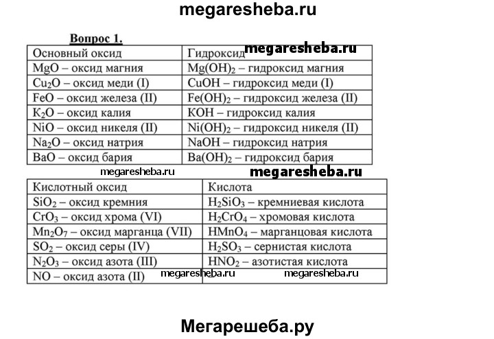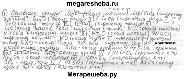 1. Из перечня формул выпишите отдельно формулы основных и кислотных оксидов и запишите соответствующие им формулы оснований и кислот: SiO2, СгО3, MgO, Mn2O7, Cu2O, SO2, FeO, N2O3, K2O, NiO, Na2O, NO, BaO. Назовите все вещества.