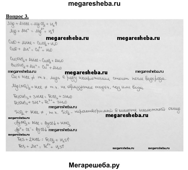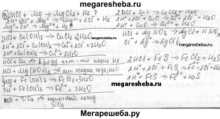 3. Какие из перечисленных ниже веществ взаимодействуют с соляной кислотой: магний, оксид меди (II), гидроксид меди (II), медь, нитрат магния, гидроксид железа (III), оксид кремния (IV), нитрат серебра, сульфид железа (II)? Запишите уравнения возможных реакций в молекулярной и ионной формах. Если реакции не могут быть осуществлены, объясните почему.