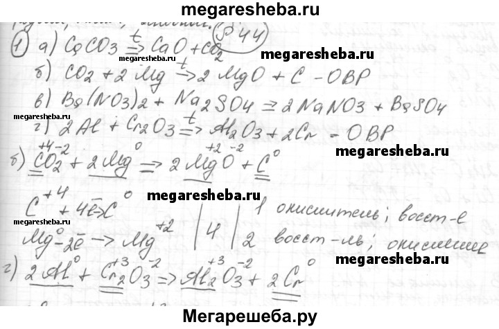 1. Какие из реакций, уравнения которых записаны ниже, относят к окислительно-восстановительным? а) CaCO3 =(t) CaO + CO2; б) CO2 + 2Mg =(t) 2MgO + C; в) Ba(NO3)2 + Na2SO4 = 2NaNO3 + BaSO4; г) 2Al + Cr2O3 =(t) Al2O3 + 2Cr. Для окислительно-восстановительных реакций укажите окислитель и восстановитель, процессы окисления и восстановления, составьте электронные уравнения.