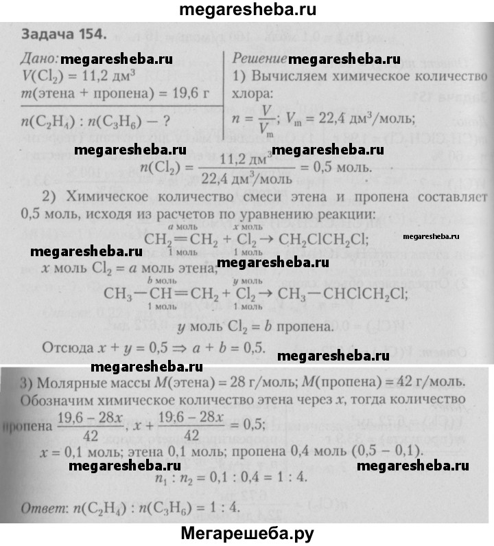 154. При взаимодействии смеси этена и пропена массой 19,6 г с хлором объемом (н. у.) 11,2 дм3 в газовой фазе образовались соответствующие продукты реакции. Определите количественное отношение газов в смеси.