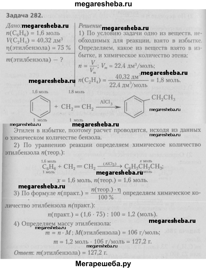282. Алкилирование бензола в промышленности обычно осуществляют алкенами. Вычислите, какую массу этилбен зола получают при взаимодействии бензола химическим количеством 1,6 моль и этена объемом (н. у.) 40,32 дм3 в присутствии безводного хлорида алюминия, если выход этил бензола составляет 75 %.