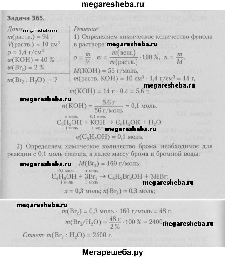 365. Раствор фенола в воде массой 94 г нейтрализовали раствором гидроксида калия объемом 10 см3 (плотность 1,4 г/см3) с массовой долей щелочи 40 %. Определите массу бромной воды с массовой долей брома 2 %, необходимой для реакции с такой же массой раствора фенола в воде.