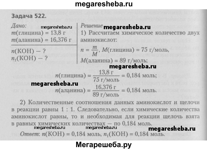 522. Имеется два раствора аминокислот, в которых содержатся глицин массой 13,8 г и аланин массой 16,376 г. К обоим растворам добавили раствор гидроксида калия, ровно столько, чтобы аминокислоты полностью вступили в реакцию со щелочью. Рассчитайте, какое химическое количество гидроксида калия потребовалось для реакции в каждом случае.
