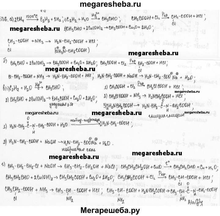536. Составьте уравнения реакций, при помощи которых можно осуществить следующие превращения: а) метан → ацетилен → уксусная кислота → хлоруксусная кислота →аминоуксусная кислота; б) этаналь → этановая кислота → 2-хлорэтановая кислота →2аминоэтановая кислота →натриевая соль ами ноэтановой кислоты; в) ацетилен → уксусная кислота → глицилглицин → натриевая соль аминоуксусной кислоты; г) 1хлорпропан → пропанол-1 →пропаналь → пропановая кислота →2-хлорпропановая кислота →2-аминопро пановая кислота → аланилглицин.