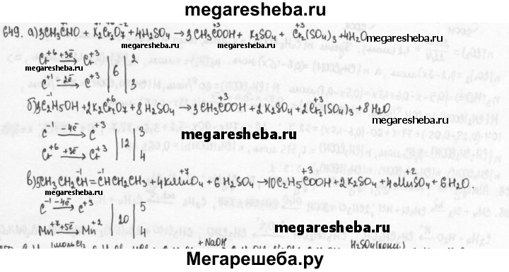 649. Используя метод электронного баланса, составьте уравнения химических реакций, протекающих по схемам: а) СН3СНО + К2Сr207 + H2S04 → СН3СООН + К2SO4 + Cr2(S04)3 + H2O; б) С2Н5ОН + К2Сr207 + H2S04 → СН3СООН + K2S04 + Cr2(S04)3 + H2O; в) СН3СН2СН=СНСН2СН3 + КМn04 + H2S04 →С2Н5СООН + K2S04 + MnSO4 + H2O.