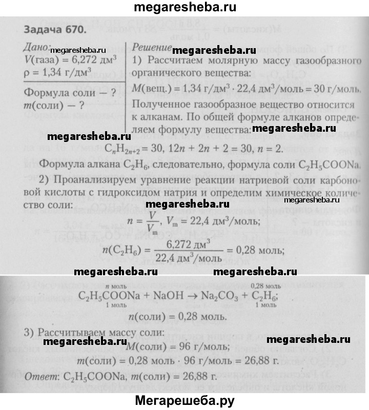 670. Определите формулу натриевой соли одноосновной насыщенной карбоновой кислоты, при сплавлении которой с кристаллическим гидроксидом натрия выделилось газообразное органическое вещество объемом (н.у.) 6,272 дм3, плотность которого (н.у.) равна 1,34 г/дм3. Рассчитайте массу соли.
