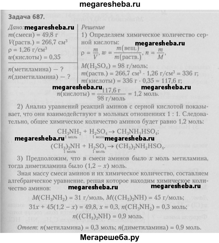 687. Смесь метиламина и диметиламина массой 49,8 г прореагировала с раствором серной кислоты объемом 266,7 см3 (плотность 1,26 г/см3) с массовой долей кислоты 35 %. Определите химическое количество метиламина и диметиламина в смеси.