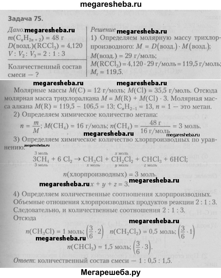 75. При прямом хлорировании неизвестного алкана массой 48 г образовалась смесь моно-, ди- и трихлорзамещенных углеводородов. Объемные отношения продуктов реакции в газовой фазе 2:1:3. Относительная плотность паров трихлорзамещенного соединения по воздуху равна 4,120. Вычислите количественный состав образованной смеси.