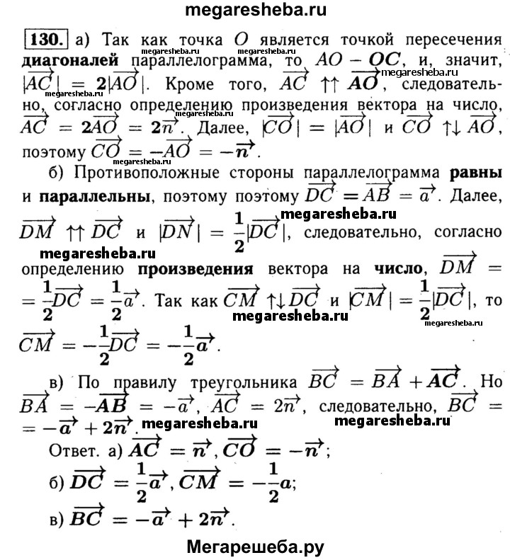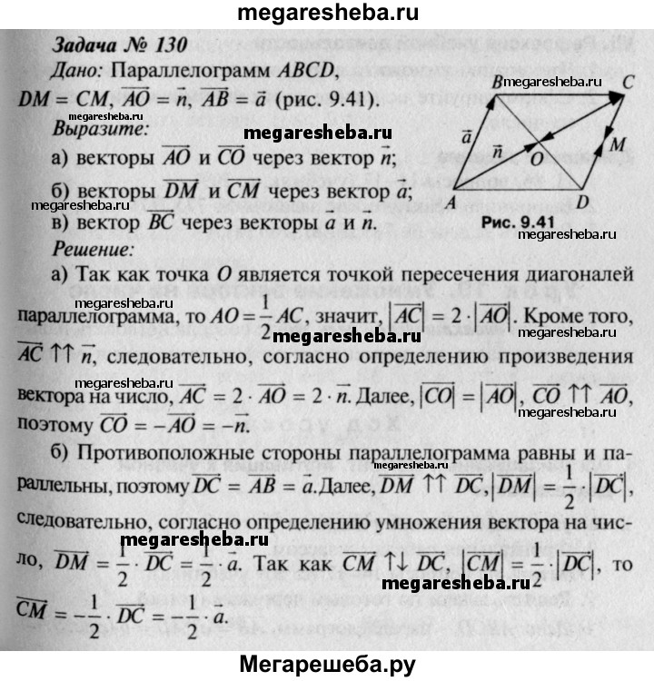 130.На рисунке изображен параллелограмм ABCD, где DM = СМ, АО = n, АВ = a. Выразите: а)векторы АС и СО через вектор n; б)векторы DM и СМ через вектор а; в)вектор ВС через векторы а и n.