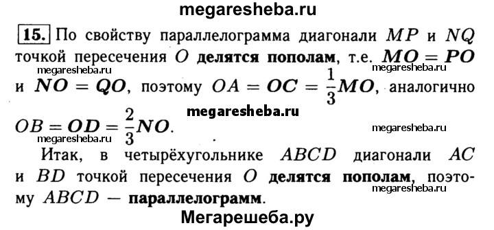 15.На рисунке диагонали параллелограмма MNPQ пересекаются в точке О. Докажите, что четырехугольник ABCD является параллелограммом, если ОА= 1/3 OM, ОВ = 2/3 ON, ОС = 1/3 ОР,OD = 2/3 OQ.