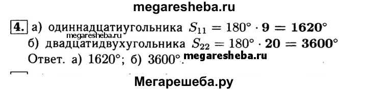 4. Используя формулу для вычисления суммы углов выпуклого многоугольника Sn = 180°(n - 2), найдите сумму углов, выпуклого: а)одиннадцатиугольника: S11 = 180° • 9 = 1620 б)двадцатидвухугольника: S22 = 180 • 20 = 3600