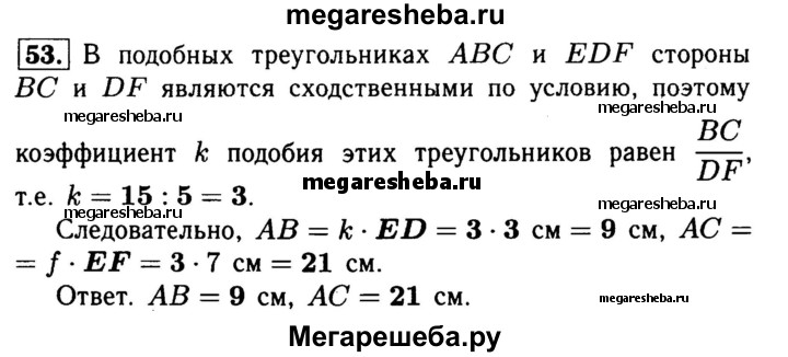 53.В подобных треугольниках ABC и EDF стороны АВ и ED, ВС и DF являются сходственными. Найдите стороны АВ и АС треугольника ABC, если ED = 3 см, DF = 5 см, EF - 7 см, ВС = 15 см.