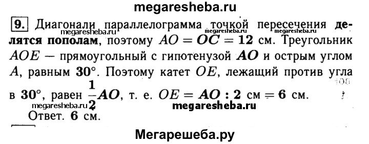 9.В параллелограмме ABCD диагональ АС, равная 24 см, образует со стороной AD угол в 30°, О — точка пересечения диагоналей АС и BD, ОЕ ⊥ AD. Найдите длину отрезка ОЕ.